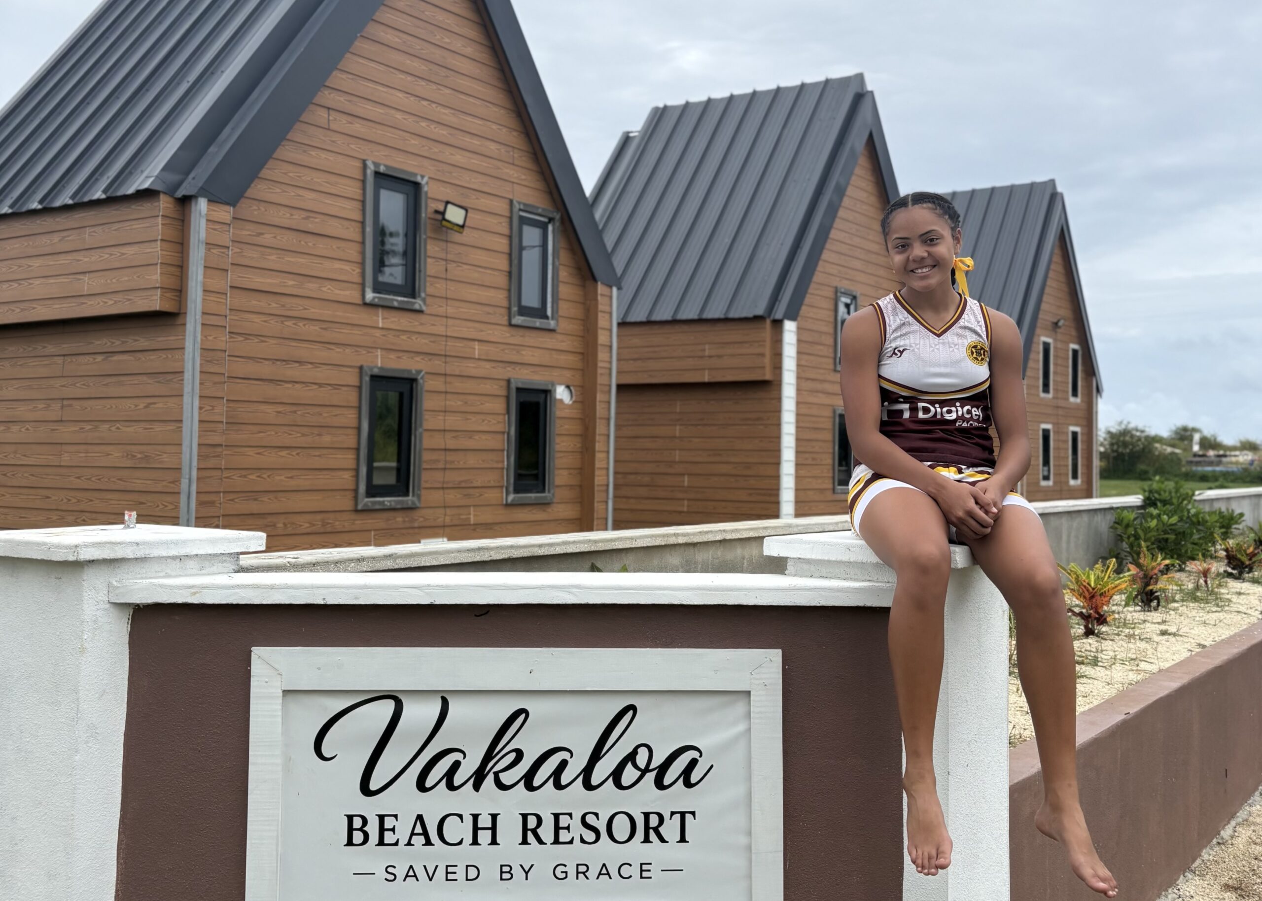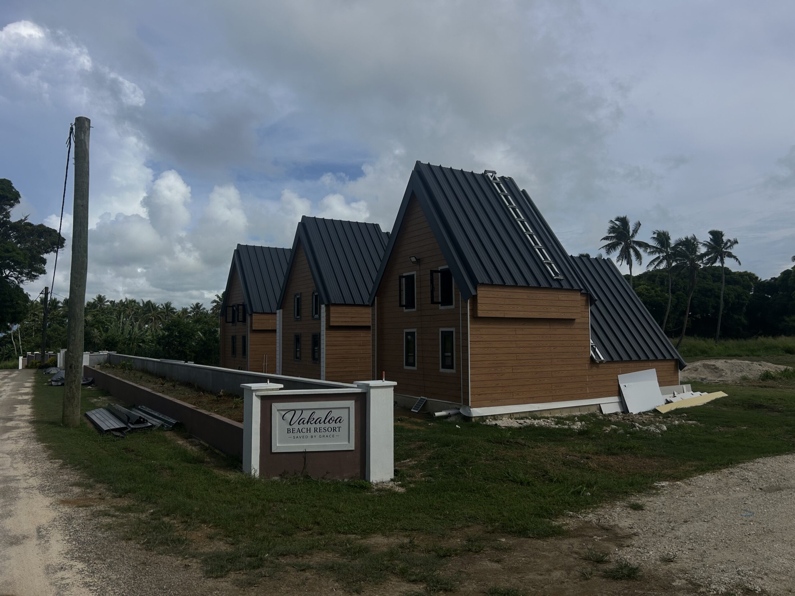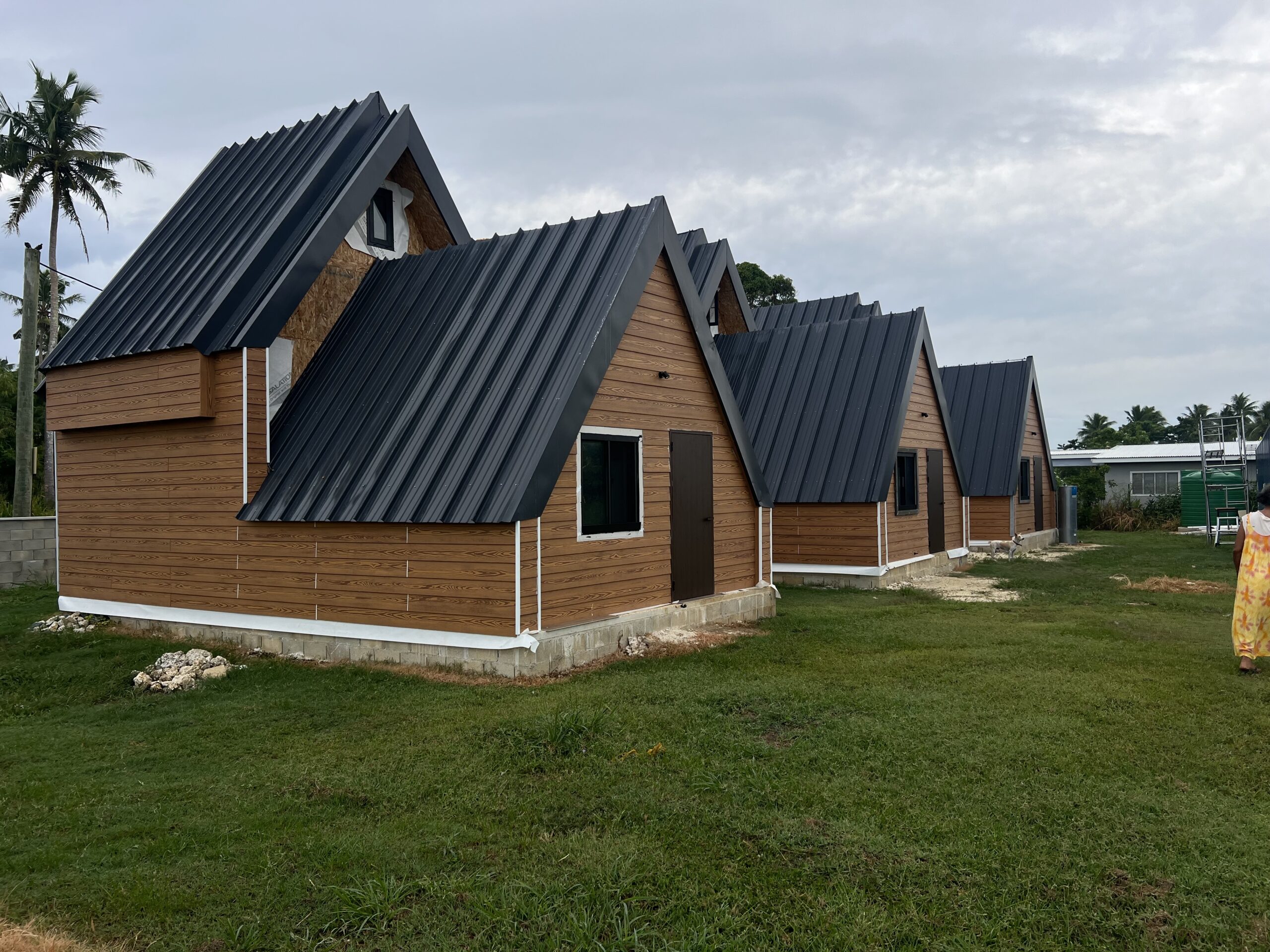 A tropical beachfront scene with palm trees, lush green vegetation, and multiple wooden cottages nestled amongst the greenery. The foreground features a sandy beach with gentle waves washing onto the shore. Large boulders are scattered along the coastline, and a hillside covered in dense foliage rises in the background.